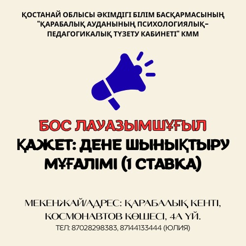 Қостанай облысы әкімдігі білім басқармасының “Қарабалық ауданының психологиялық-педагогикалық түзету кабинеті” коммуналдық мемлекеттік мекемесі Қазақстан Республикасы Білім Министрінің 2025 жылғы 31 наурыздағы № 57 және Қазақстан Республикасы Еңбек және халықты әлеуметтік қорғау министрінің 2025 жылғы 31 наурыздағы № 96 “лауазымдарға тағайындау, лауазымдардан босату қағидаларын бекіту туралы” бірлескен бұйрығына сәйкес мемлекеттік білім беру ұйымдарының бірінші басшылары мен педагогтері”. 1 ставка мөлшерінде дене шынықтыру мұғалімі бос лауазымға конкурс жариялайды.